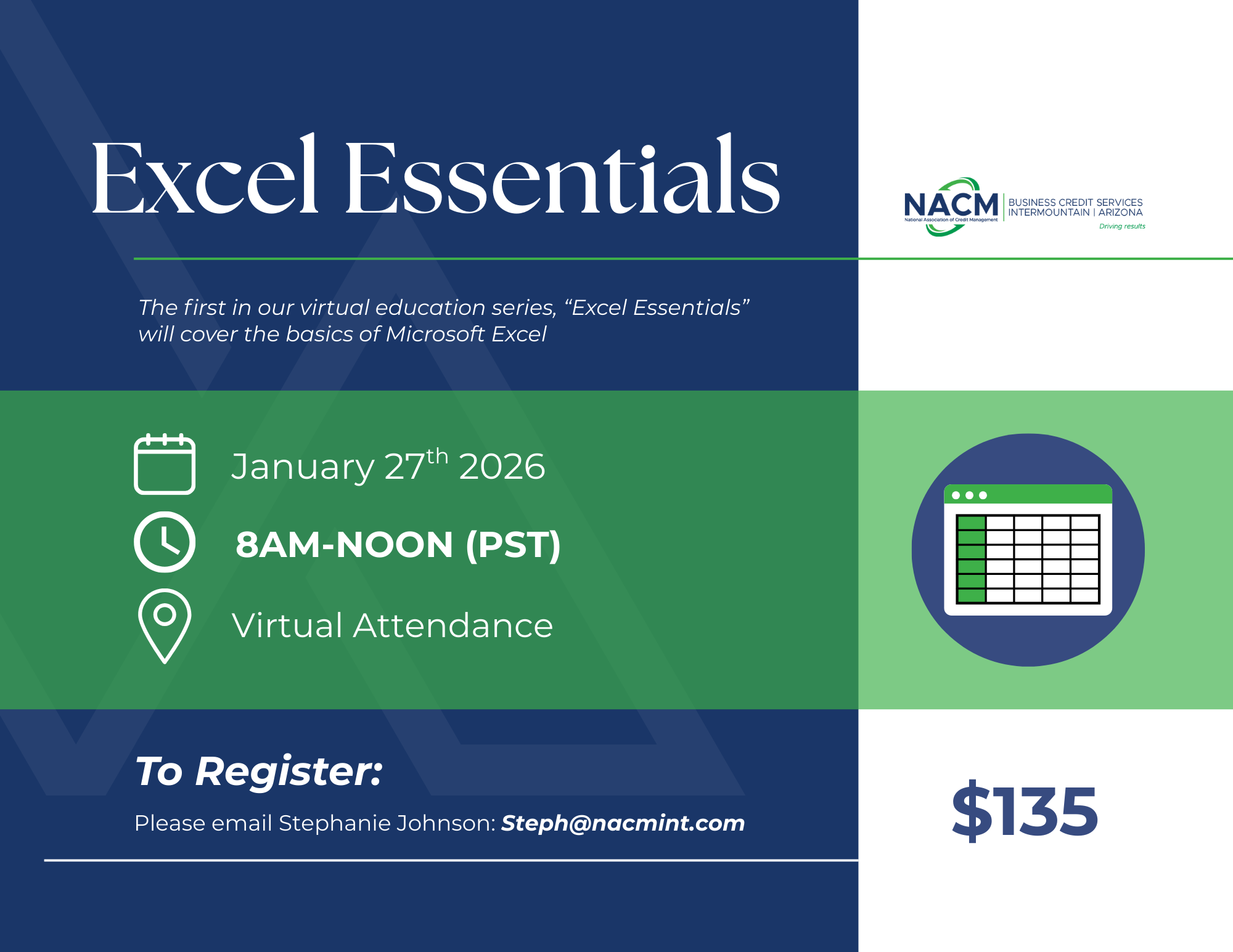This virtual Microsoft Suite series class taught by Neal Otto will follow the schedule below. Each class must be registered for by emailing steph@nacmint.com; cost per class is $135/pp. The series is a la carte and no one must attend every class. All times are Mountain.